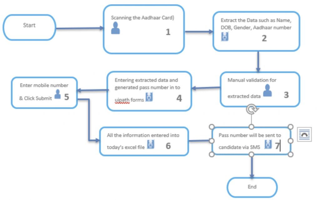 Meena Muthukrishnan built a UiPath robot that helps companies in India with a faster check in for their interview candidates. When the candidate approaches the Front Office Executive (FOE) to obtain an entry pass, the FOE will collect and scan the Aadhaar card. As soon as the Aadhaar card is scanned, the bot will start to extract the details such as Name, DOB, Gender, Aadhaar Number and Generate pass number.