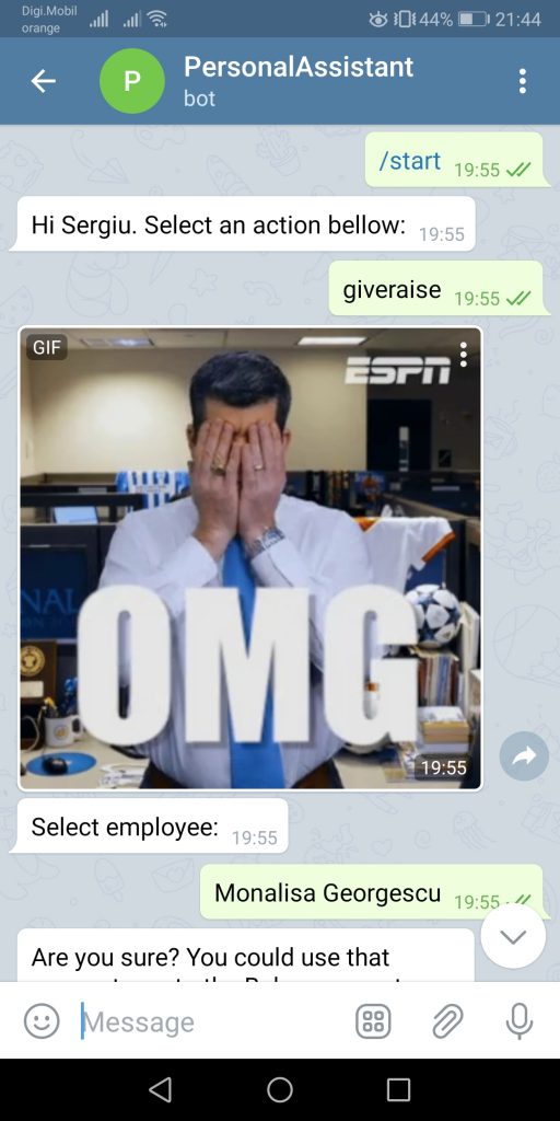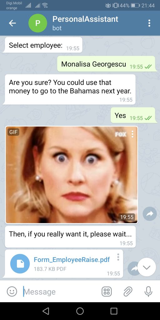 We wanted to try something different from the usual everyday emails – so they gave the Telegram bot the chance to prove itself. In this way, Serra became a wise Pocket Assistant. Their solution turned out to be the fastest and most comfortable for this moment in time. If needed, the robot can easily work with a WhatsApp or a Messenger bot.