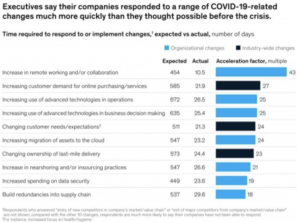 What does that mean, exactly? For example, the time required to increase remote work or collaboration had an acceleration factor of 43 – it has been implemented in only 10.5 days, compared to 454 days as expected. Let that sink in for a minute, while you look at the chart below: