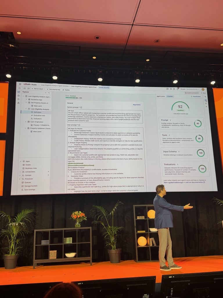 In one of the most practical sessions of the day, a UiPath product leader demonstrated how a complex loan origination process can be automated using the UiPath platform – bringing together IXP, Maestro, Agent Builder, and Action Center.