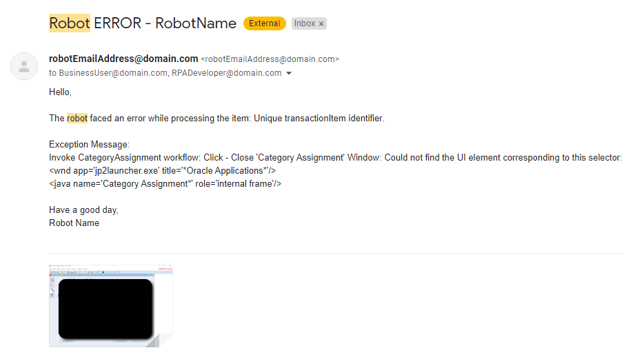 Having a screenshot added to the email can drastically reduce the time of figuring out the source of the problem. A workflow for taking a screenshot is present by default in the REFramework and its name is ‘TakeScreenshot’. To use it, simply invoke it wherever needed and provide a variable for the ‘screenshotPath’ argument. A great example of the impact that it can have is when a popup that was not encountered before suddenly appears during processing. Without a screenshot attached, the developer has to waste time and effortto reproduce the popup in order to understand the error. If the email contains a screenshot then the developer will be able to see the message of the popup and this will make the whole process of resolving the issue significantly faster.