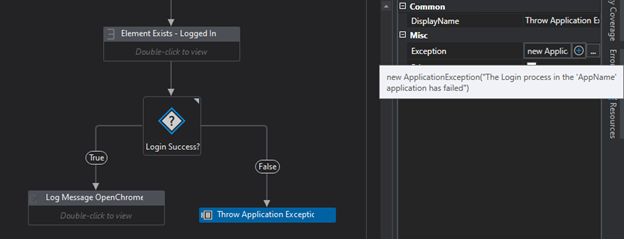 It is important for the developer to throw exceptions in cases in which having an automatically thrown exception can be misleading. A good example of this is the following: After logging into a website, the robot fails the first ‘Click’ that it should do. This is generally caused by the robot not actually successfully logging into the website. The developer should first check if the robot successfully logged in and, in the case in which the login failed, throw an exception with a representative message. If the exception is automatically thrown, the user will see a message like: “Click ‘ButtonName’ Button Failed.” However, if the exception is intentionally thrown by the developer, the message would be: “The robot failed to login into the ‘WebsiteName’ website.” You can already see how useful intentionally throwing exceptions can be towards helping the user understand the issue.