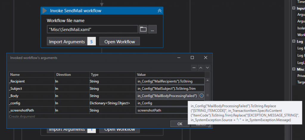 The other component of the email, besides the attachments, is the body of the email itself. The best method to store and use the body of the email is to get it from the configuration file and have it contain placeholders for relevant data. Those placeholders will then be replaced with actual values when the value is sent to the ‘SendEmail’ workflow as an argument.