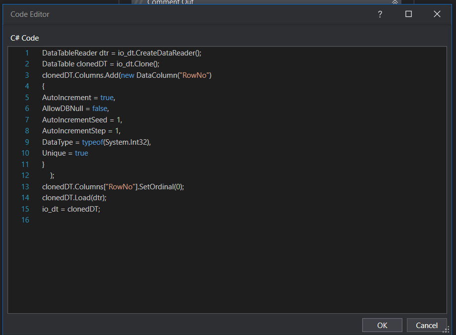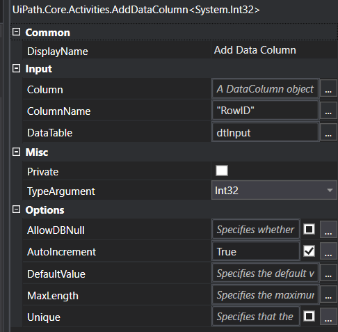 Using the UiPath Activity to add an auto number column can be a helpful shortcut. The downside, however, is that you will not have the auto numbered values after. In fact, you add just a column with no data. The auto number columns are useful because they help you uniquely identify a row within a collection of rows.